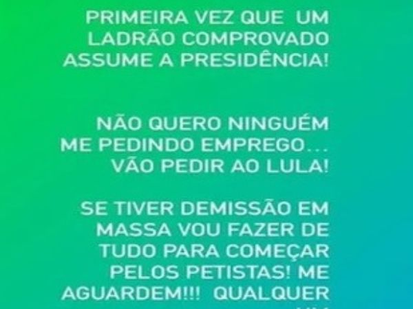 Karina Lopes, que é natural do Rio de Janeiro, em suas redes sociais demonstra apoio à reeleição do presidente Jair Bolsonaro (PL), opositor de Lula (PT), e publicou a ameaça aos funcionários petistas da empresa nos stories do seu Instagram.