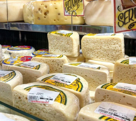 Dia desses, fui a um mercado público em São Paulo e parei em frente a uma banca de laticínios. Como você pode perceber pela foto, ela expõe vários queijos minas cortados ao meio, cheios de pequenos furos na massa. Um pouco acima na imagem, há outro queijo, mais amarelado, com furos maiores.