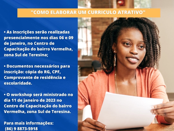 A Prefeitura de Teresina por meio da Fundação Wall Ferraz abriu vagas para workshops de qualificação e orientação profissional, que acontecerão do dia 10 ao dia 12 de janeiro, das 14h às 18h, no Centro de Capacitação do bairro Vermelha, zona Sul de Teresina.
