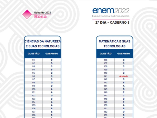 Os gabaritos dos dois dias de prova do Exame Nacional do Ensino Médio (Enem) 2022 foram divulgados nesta quarta-feira (23), no site do Instituto Nacional de Estudos e Pesquisas Educacionais Anísio Teixeira (Inep). Confira as tabelas abaixo.
