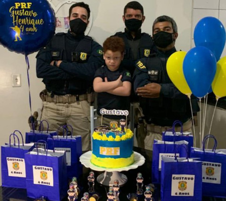 Os policiais participaram da festinha e cantaram os parabéns para o pequeno Gustavo Henrique que pousou com estilo para a foto junto dos policiais. Toda a decoração feita pelos familiares tinham as cores e os símbolos da PRF.