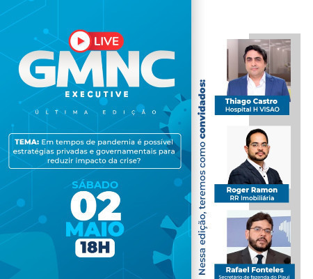 Neste sábado (2), às 18h, o Grupo Meio Norte de Comunicação realizará mais uma edição da live GMNC Executive, onde reunirá grandes empresários do país para discutir sobre a economia durante a pandemia do Coronavírus. O tema da conversa será: ‘Em tempos de pandemia é possível estratégias privadas e governamentais para reduzir impacto da crise’?