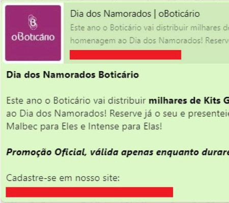 Um novo golpe compartilhado por meio do aplicativo WhatsApp promete perfume da marca ‘O Boticário’. A ação utiliza o Dia dos Namorados, comemorado em 12 de junho, como isca. De acordo com informações do dfndr lab, divisão de segurança da PSafe, quase 40 mil pessoas já foram impactadas em apenas uma semana pela fraude.