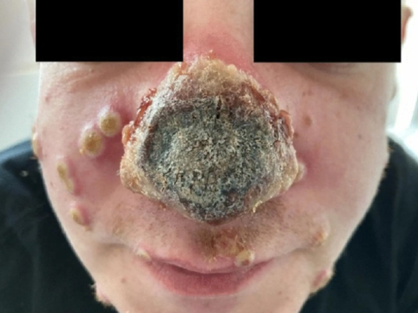 No entanto, um paciente com HIV que está tomando medicação teve uma manifestação de varíola dos macacos parecida. Começou com uma mancha vermelha no nariz, que acabou infeccionando.