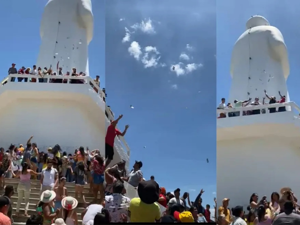 Um homem jogou várias notas de dinheiro para as pessoas que visitavam a Estátua de Padre Cícero na Colina do Horto, em Juazeiro do Norte, no Ceará. O caso aconteceu nesta segunda-feira (31) e segundo testemunhas, o homem pagava uma promessa.