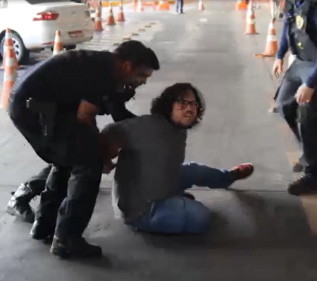 Após ser atingido, o homem cai no chão. Alguns segundos depois, ele retira os aparelhos de choque do corpo. Antes que consiga se levantar, policiais o algemam e o levam.