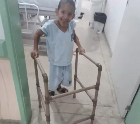 Aos 8 anos, João Vitor consegue finalmente andar sem se segurar nas paredes ou precisar do auxílio de um adulto. Isso é possível por conta de uma invenção feita por funcionários do Hospital Escola Hélvio Auto, em Maceió, que constrói objetos de acessibilidade com tubos de PVC e doa a pacientes pobres.