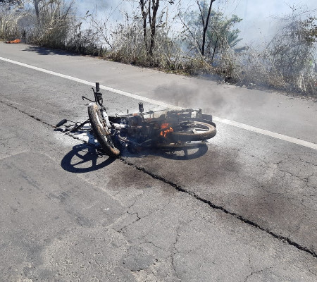 Os policiais realizaram as devidas diligências e concluíram preliminarmente que a motocicleta invadiu a faixa contrária após tentar fazer uma conversão à esquerda, colidindo frontalmente com o veículo de passeio. O condutor da motocicleta não era habilitado e não usava o capacete de segurança no momento do acidente. Após a batida, a moto pegou fogo e parte das chamas também atingiram o motociclista.