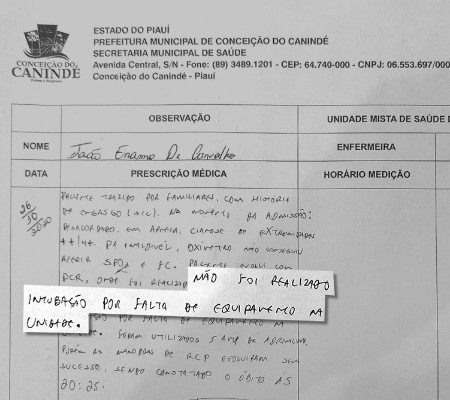 A ficha médica confirmou que o paciente ainda sofreu uma parada cardiorrespiratória. “No momento da admissão: desacordado, em apneia (sem respirar), cianose de extremidades (mãos e pés arroxeados). Pressão arterial inaudível, oxímetro não conseguiu aferir SPO2 e FC (saturação de oxigênio e frequência cardíaca). Paciente evoluiu com parada cardiorrespiratória, onde foi realizado o protocolo de RCP (ressuscitação cardiopulmonar) por 25 minutos. Não foi realizada intubação por falta de equipamento na unidade. Foram utilizadas 5 ampolas de adrenalina, porém as manobras de RCP evoluíram sem sucesso, sendo constatado o óbito às 20h25”, diz trecho da ficha.