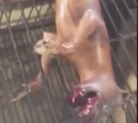 Um vídeo compartilhado pelo grupo de campanha No To Dog Meat, mostra um cão latindo com fortes dores, tentando abrir a mandíbula aos gritos, enquanto é cozido em um churrasco no mercado de carne de Yulin.