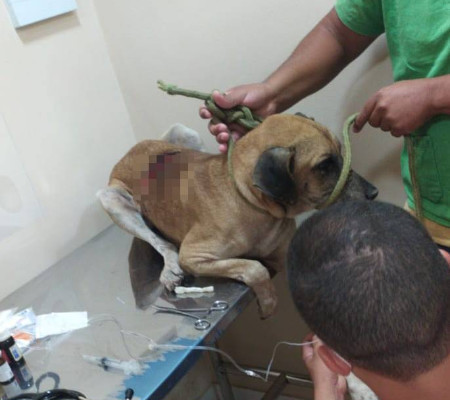 O animal foi socorrido gravemente ferido. Ele recebeu atendimento veterinário gratuito em um Pet Shop da cidade, onde se recupera da lesão e posteriormente será encaminhado para adoção. Algumas imagens abaixo precisaram ser borradas por apresentar conteúdo forte.