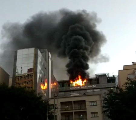 Um incêndio atinge o andar superior do Hospital do Coração, no Paraíso, Zona Sul de São Paulo, na tarde desta sexta-feira (28). As chamas podem ser vistas à distância.