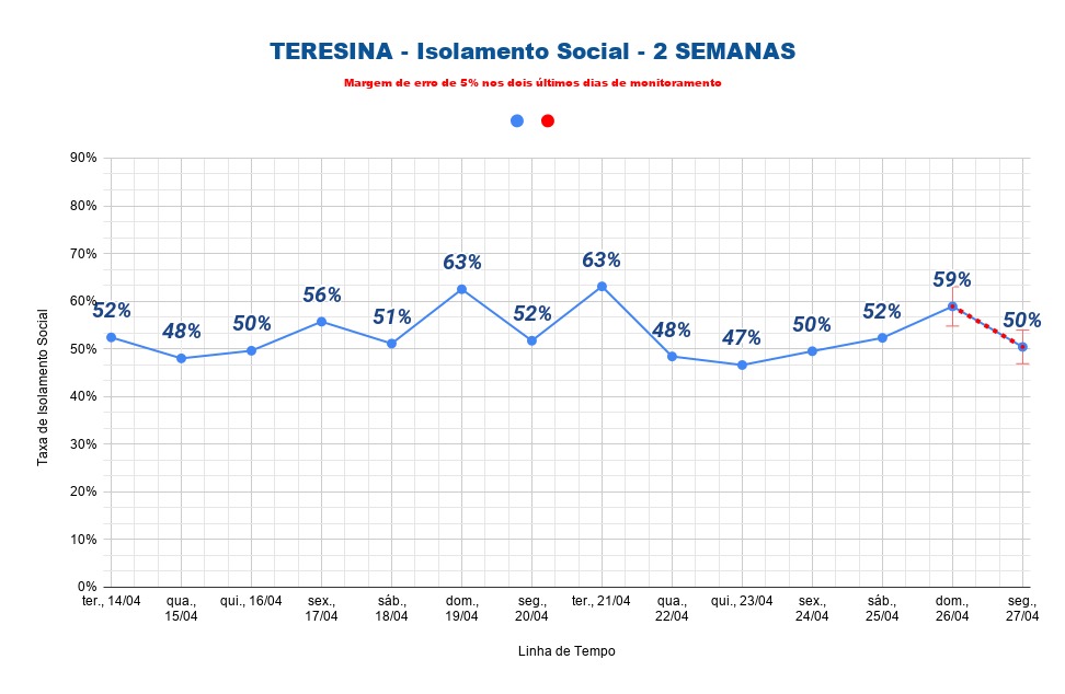 O levantamento diário feito pela startup InLoco constatou que o índice de isolamento social em Teresina voltou a cair nesta segunda-feira (27), ficando em 50%. O domingo (26) apontou um percentual de 59%, que apesar de ser maior que o da segunda, ainda configurou como o pior registro de isolamento para este dia, que costuma ficar entre 62% e 64%. Em geral, os números continuam bem abaixo do índice mínimo recomendado pelas autoridades da saúde para diminuir o contágio, que é 73%.