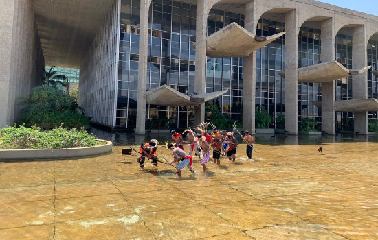 Ao deixar a Praça dos Três Poderes, os indígenas entraram no espelho d'água do Palácio da Justiça, onde fica a sede do Ministério da Justiça e Segurança Pública e se refrescaram no local (foto abaixo). No horário, o índice de umidade relativa do ar na região era de 25%, e os termômetros marcavam 31ºC.