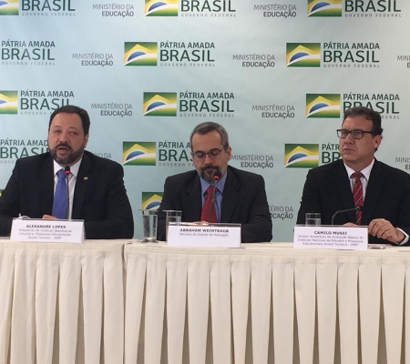 Alexandre Lopes, presidente do Inep, Abraham Weintraub, ministro da Educação, e Camilo Mussi, diretor de Avaliação Básica do Inep, em entrevista coletiva -G1igital no piloto;