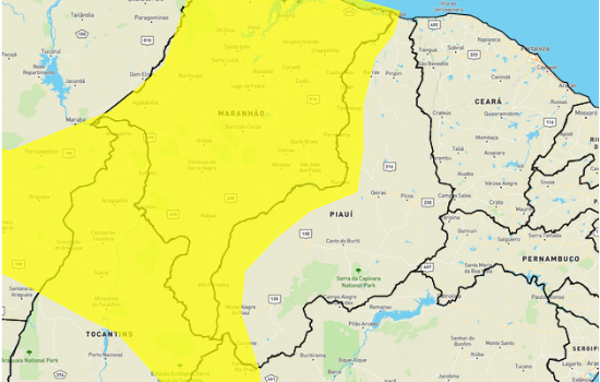 No Piauí, a área de alerta de Perigo Potencial compreende 74 municípios localizados próximos à divisa com os estados do Maranhão, Tocantins e Bahia. O aviso é válido até as 10h30 desta quinta-feira (10)