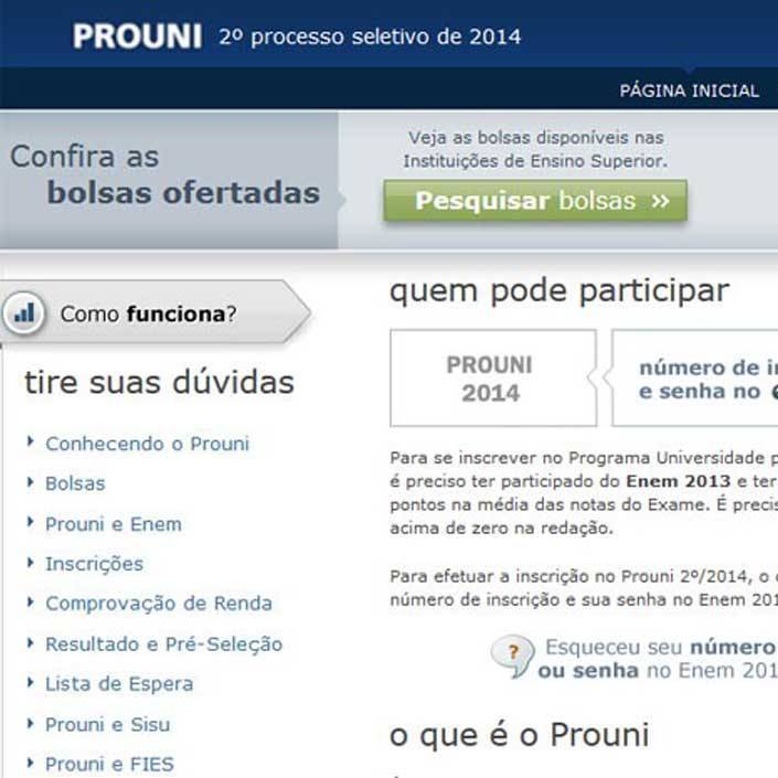 Como participar Para se inscrever, o candidato precisa ter feito o Exame Nacional do Ensino M?dio (Enem) em 2013 e ter conclu?do o ensino m?dio integral ou parcialmente na rede p?blica, ou integral ou parcialmente na rede privada, desde que tenha recebido bolsa de estudos integral. A participa??o ? vedada a quem j? tem um diploma de curso superior. Tamb?m se encaixam nos requisitos do Prouni os estudantes com defici?ncia e os professores da rede p?blica que atuem na educa??o b?sica.