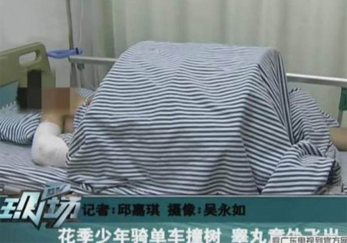 Um adolescente teve seus testículos arrancados depois de bater sua bicicleta em uma árvore dentro de uma fazenda na China. Xiao Pan foi arremessado para a frente de sua bicicleta, e sua bolsa escrotal ficou presa no guidão, arrancando-lhe de seu corpo.