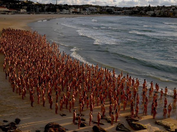Tunick é conhecido por suas fotos artísticas de multidões nuas em pontos turísticos em todo o mundo, incluindo a Ópera de Sydney em 2010. "É justo que eu use minha plataforma para instar as pessoas a fazerem exames regulares para prevenir o câncer de pele", disse Tunick.