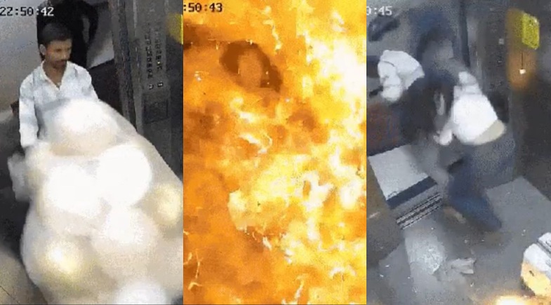 Segundo o jornal Times of India, as imagens mostram um funcionário de uma loja entrando no elevador com balões, junto de uma estudante de 21 anos. Em seguida, os balões explodem, lançando chamas. Na sequência, os dois saem correndo do local.