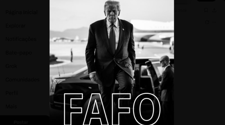 O perfil oficial da Casa Branca publicou, neste sábado (3), uma imagem do presidente dos Estados Unidos, Donald Trump, acompanhada da sigla “FAFO”, na rede social X, antigo Twitter. A publicação ocorreu após a prisão do presidente da Venezuela, Nicolás Maduro, por autoridades norte-americanas.