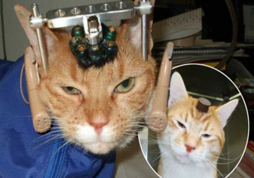 Muita pesquisa feita em gatos tem a ver com o seu olho, por conta da semelhança com o do ser humano. A placa foi aparafusada nos crânios de 10 gatinhos e foram colocados de cabeça para baixo com grampos em suas costas e acima da pélvis. As incisões foram feitas para inserir eletrodos nos nervos ao redor da coluna e da caixa torácica, e parte da medula espinhal foi exposta. Finalmente, parte do crânio foi removido para um eletrodo poder ser inserido e ser possível medir a atividade cerebral.