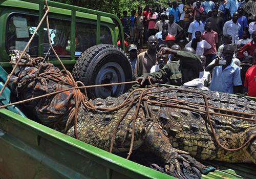 Um crocodilo gigante, que supostamente teria comido 4 pescadores, foi capturado por agentes florestais no vilarejo de Kakira, em Uganda. O animal pesa uma tonelada e possui aproximadamente 80 anos de vida.
