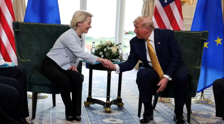 Von der Leyen respondeu que o pacto é baseado em “justiça e reequilíbrio” e descreveu Trump como um “negociador duro”.