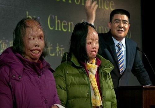Finalmente, Chen exibiu as duas mulheres com suas queimaduras horríveis. Um pequeno protesto do lado de fora afirmava que as mulheres estavam sendo usadas como propaganda do governo da China.