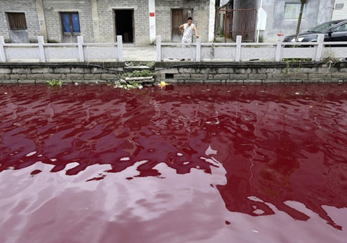 Imagem divulgada neste fim de semana por agências de notícias internacionais mostram um rio do condado de Cangnan, em Wenzhou, na China, que teve sua água tingida de vermelho. A ocorrência foi no dia 24 de julho.