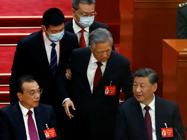 Hu, 79, é o antecessor imediato de Xi Jinping e estava sentado à esquerda do atual líder. Ele foi levado para fora do palco do auditório principal do Grande Salão do Povo em Pequim por dois comissários.