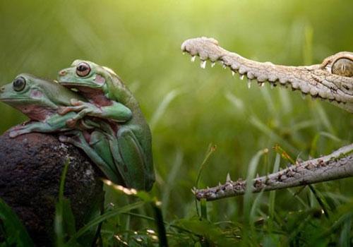 Ele relatou que passou 4 horas fotografando animais na região de Jacarta, na Indonésia, e capturou o curioso instante. Mas, segundo Fahmi, o crocodilo, que ameaçou engolir os sapos, não deu o bote e apenas se deitou próximo aos anfíbios para descansar.