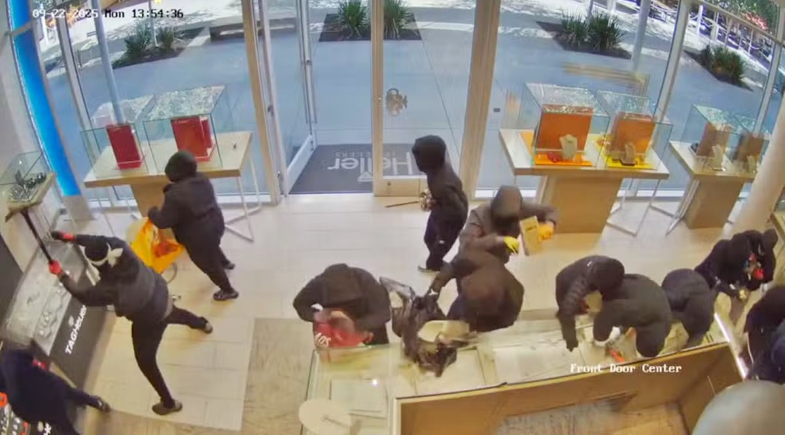 Um grupo de cerca de 20 assaltantes invadiu uma joalheria na Califórnia, nos Estados Unidos, na segunda-feira (22). Segundo a imprensa americana, eles fugiram levando mais de US$ 1 milhão (R$ 5,3 milhões) em mercadorias. A ação foi registrada por uma câmera de segurança.
