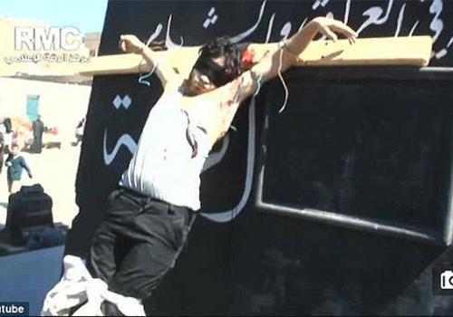 De olhos vendados, um homem foi morto com um tiro na cabeça e crucificado em praça pública pelo grupo terrorista Estado Islâmico do Iraque e Síria. Seu corpo foi deixado exposto na cidade de Raqqa.