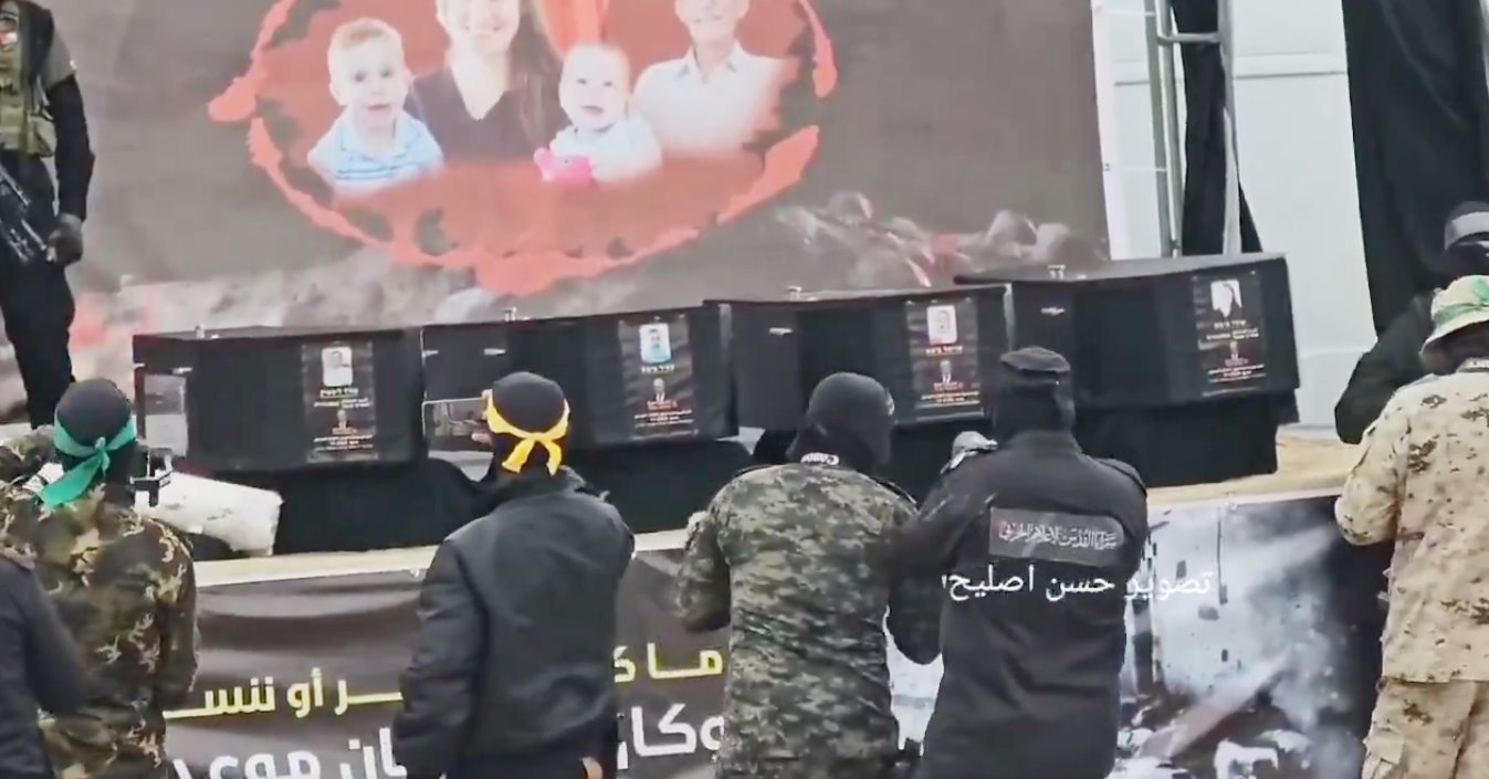 Imagens divulgadas mostraram militantes do Hamas carregando caixões pretos sobre um palco decorado com faixas e cartazes, incluindo um que retratava o primeiro-ministro israelense, Benjamin Netanyahu, como um vampiro. Os caixões foram cobertos com lençóis brancos antes de serem enviados para Israel.