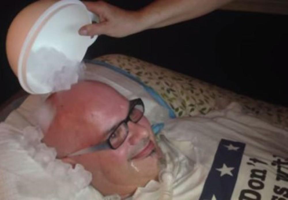 Um homem paralisado que sofrem de ALS se tornou a primeira pessoa com a doença a participar do desafio que está mobilizando a Internet.
