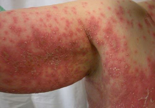 O paciente piorou seu estado e desenvolveu inflamações por quase todo o corpo. As lesões se espalharam e ele foi diagnosticado com Pustulose Exantemática Generalizada Aguda (PEGA).