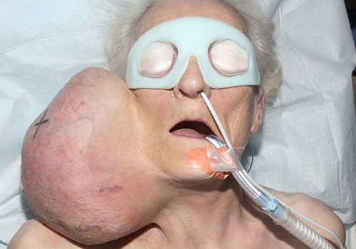 Seu marido insistia para que a esposa procurasse um médico, o que só foi feito quando o tumor começou a sangrar. Ela tinha medo da operação, mas depois de ver imagens laterais capturadas pelo médico, percebeu que realmente era necessária a operação.