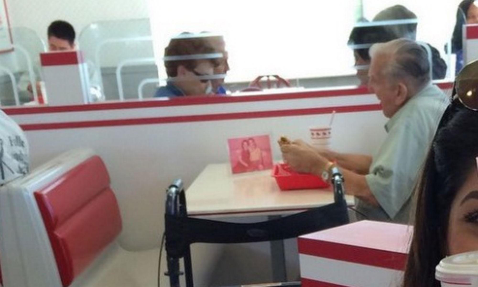Na imagem, um idoso lancha em rede de fast food na Califórnia (EUA). Mas isto é apenas um detalhe.