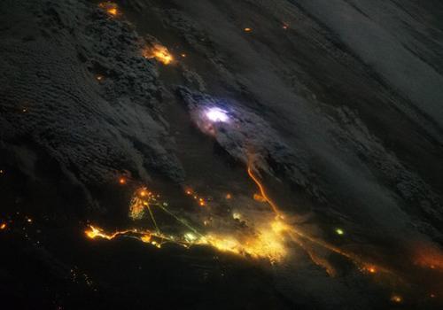 Na foto acima, é possível comparar as luzes de um relâmpago com as luzes de cidades do Kuwait e da Arábia Saudita. A imagem foi feita por um astronauta a bordo da ISS em 12 de dezembro. Na imagem abaixo, um relâmpago é visto sobre a Bolívia.
