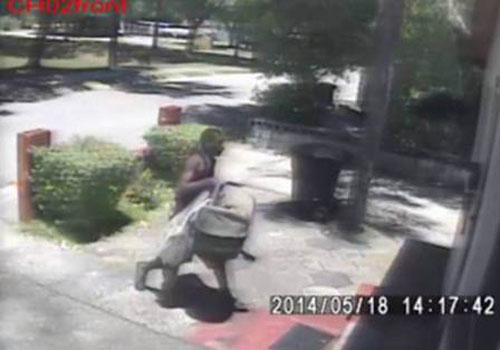 Em um vídeo do momento, o homem aparece correndo para deixar a criança numa das portas da igreja, antes de bater na porta e correr de volta para o veículo roubado.