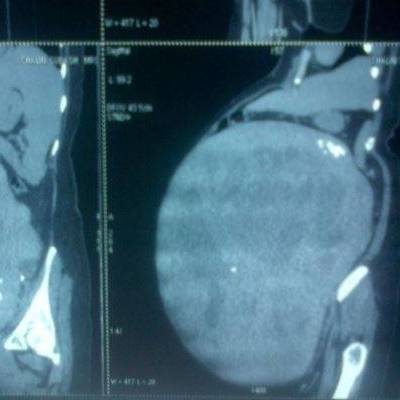 Cirurgi?es operaram mulher de 52 anos por mais de tr?s horas. A paciente n?o tinha ideia de que havia um tumor gigante instalado no seu ventre. Ele foi considerado o maior tumor uterino do mundo, pesando 13 kg e medindo 53 cent?metros de di?metro.
