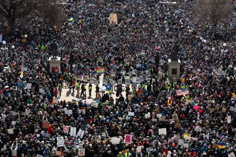 Milhares de manifestantes saíram neste sábado (5) às ruas de Washington e outras cidades dos Estados Unidos contra as políticas de Donald Trumpnos maiores protestos contra o presidente republicano desde seu retorno, no final de janeiro, ao poder.