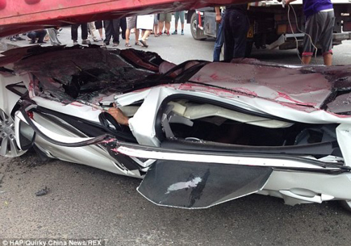 O acidente aconteceu em uma estrada na cidade de Qingdao, na China, quando um grande caminhão transportando o contêiner tombou, derrubando a sua carga sobre o carro.
