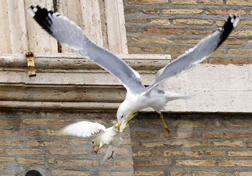 Uma pomba que foi solta pelo Papa Francisco e por duas crianças durante a oração do Ângelus realizada neste domingo (26) na Praça São Pedro, no Vaticano, foi atacada por uma gaivota pouco depois de sair voando. O ataque foi flagrado por um fotógrafo da Reuters.