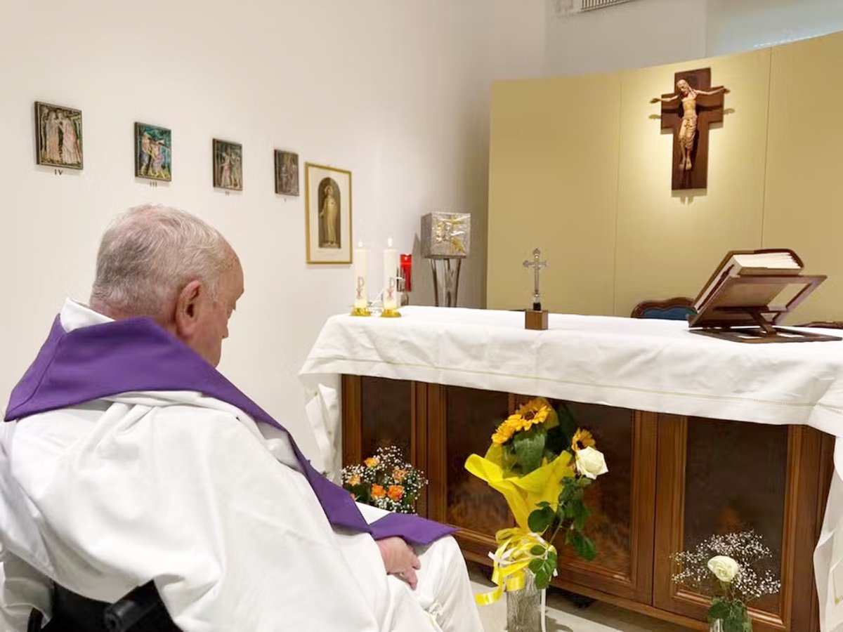 Na imagem, o Pontífice aparece de costas celebrando a Santa Missa na capela do apartamento localizado no décimo andar do hospital Policlínico Gemelli, em Roma, na Itália.