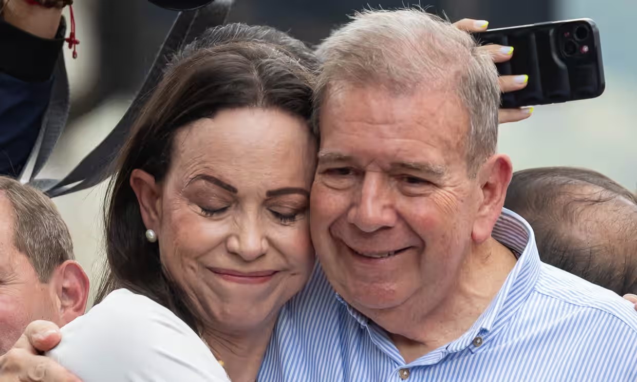 A líder da oposição venezuelana María Corina Machado abraça o candidato presidencial Edmundo González. Os EUA reconheceram González como o vencedor das eleições presidenciais do fim de semana passado | Foto: Ronald Pena R/EPA