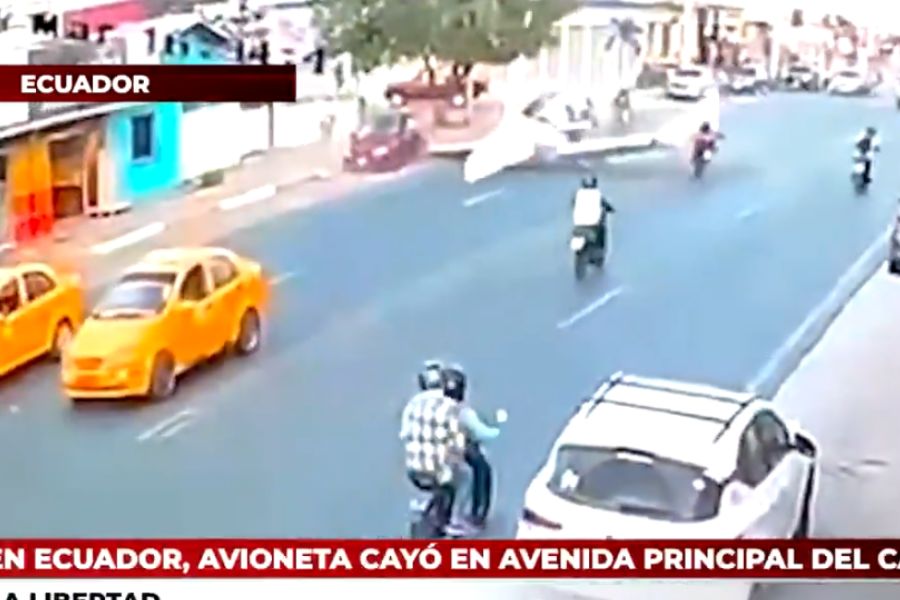 Câmeras de segurança registraram o momento em que uma aeronave de pequeno porte caiu no meio de uma rua movimentada no sudoeste do Equador, atingindo um carro que trafegava em uma das pistas. Piloto e co-piloto, que estavam na aeronave, morreram na queda.