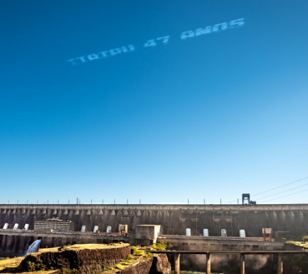 Para celebrar o momento, as aeronaves escreveram no ar a mensagem: “Itaipu 47 anos”. O voo passou exatamente sobre a barragem.