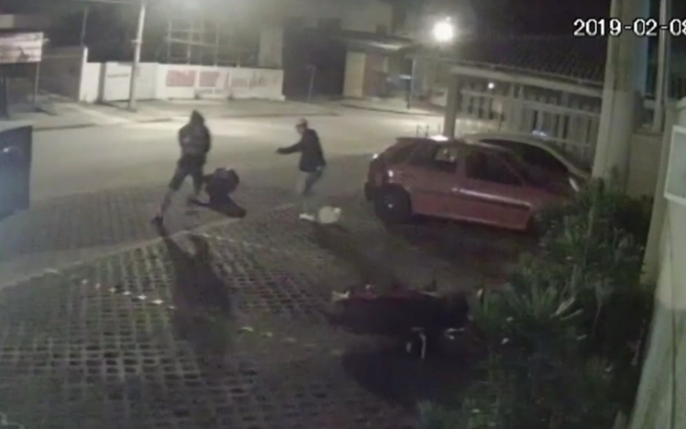 Dois homens descem e começam a disparar contra o jovem. Ele ainda se levanta da moto e tenta correr para o outro lado da rua, mas cai alguns metros depois. A mulher com quem ele conversava não se feriu. Ela conseguiu se esconder atrás de dois carros que estavam na mesma calçada.